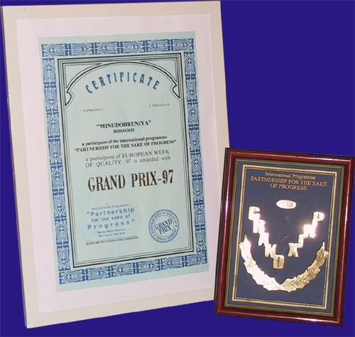 The enterprise was presented with Grand Prize for participation in the international contest “Partnership in the Name of Progress” of the programme “European Quality Week – 97” (Rome, Italy). |