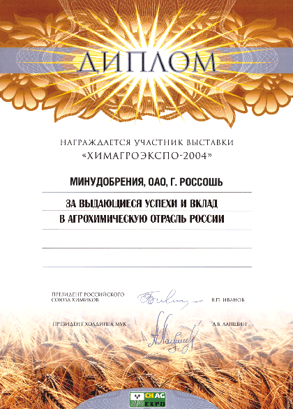 There was an International Specialized Exhibition of Agricultural Chemicalization “ChimAgroExpo-2004” in Sokolniki (Moscow) on the 10-13 of March. Minudobreniya JSC was awarded with the Diploma and Medal for Great Success and Contribution into the development of Russian Agricultre. |
