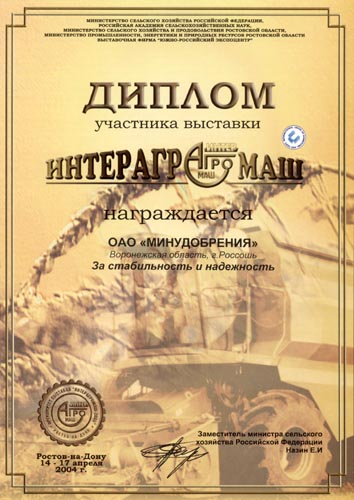 The Company was given a diploma for stability and relyability while participating in the exhibition «InterAgroMash-2004» in Rostov. |