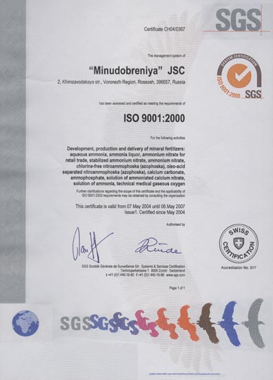 MINUDOBRENIYA JSC was awarded with the International Certificate of Conformity of the Quality Management System to the requirements of ISO 9001:2000 by the Swiss International Certificate Authority SGS in May 2004. |