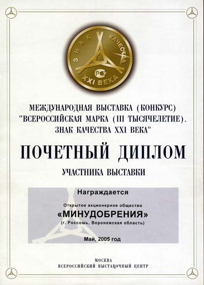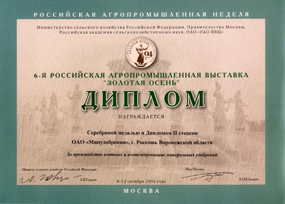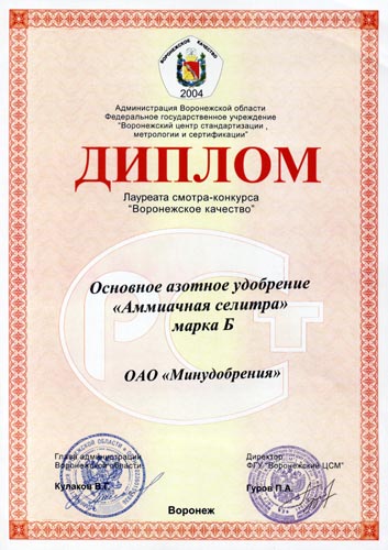 Minudobreniya JSC was presented with two diplomas for the product quality at the public showing contest «Voronezhskoje Kachestvo (Voronezh Qality) 2004» in Voronezh. |