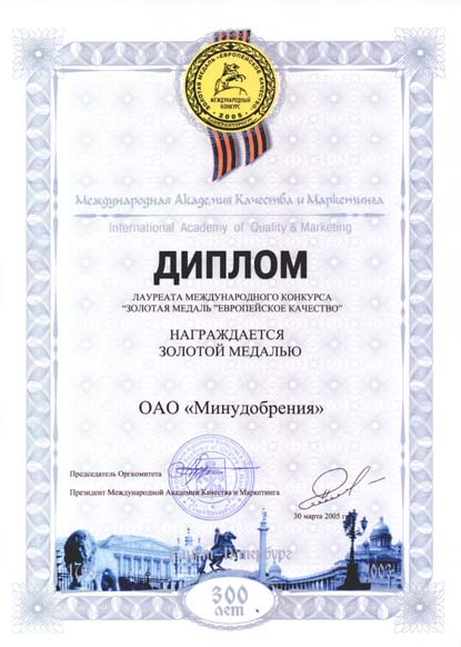 On March, 30 Minudobreniya JSC was rewarded with Gold Medal «European Quality» and prize-winner Diploma at the Competition "Gold Medal «European Quality». |