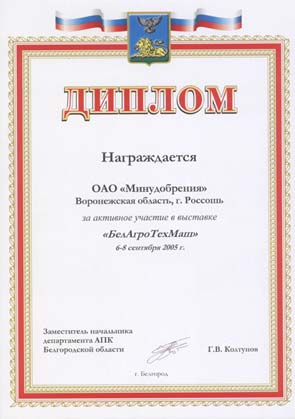 On September 6-8, 2005 «BelAfroTechMash» Exhibition took place in Belgorod, where Minudobreniya JSC was handed a Participant Honorary Diploma. |