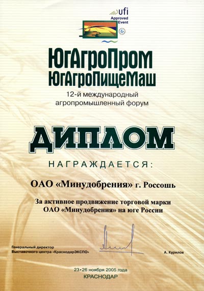 At the 12-th International Agro-Industrial Forum «YugAgroProm. YugAgroPishcheMash» Minudobreniya JSC was rewarded with Diploma «For Efficient Promotion of Minudobreniya JSC Trademark in the South of Russia». |