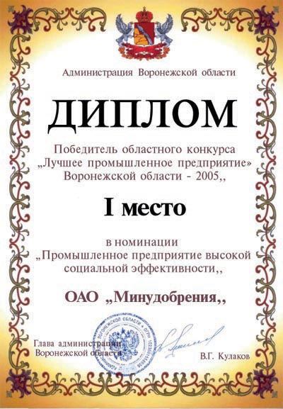 MINUDOBRENIYA JSC won the first place in the nominations “Industrial Company of High Social Efficiency” and “Oil and Chemical Industry” at the Regional competition Best Industrial Company of Voronezh Region – 2005”. |