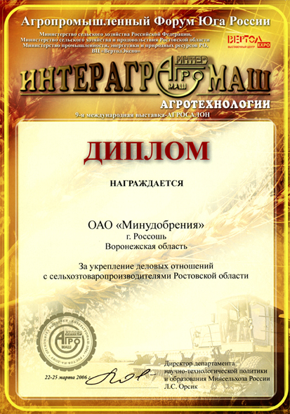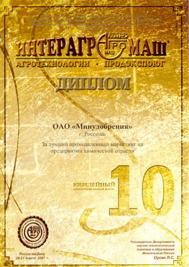 At the annual Moscow Agro Industrial Exhibition Minudobreniya JSC was awarded with 1st class Certificate for production of mineral fertilizers, and with Gold Medal of Russian Ministry of Agriculture. |