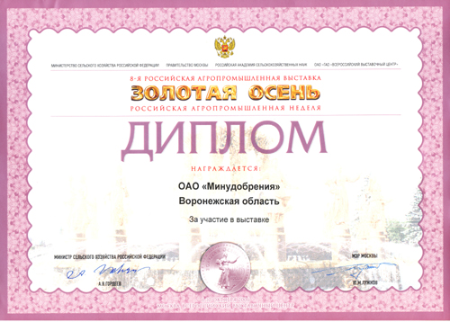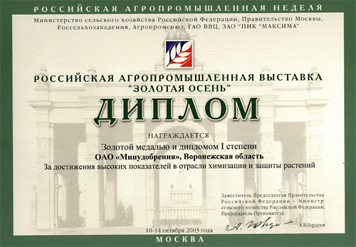 MINUDOBRENIYA JSC received a golden medal for the contribution into the development of Voronezh Region agriculture at the exhibition «Voronezh Region is Your Partner» held on July 16-18, 2004. |