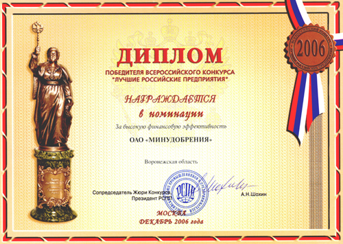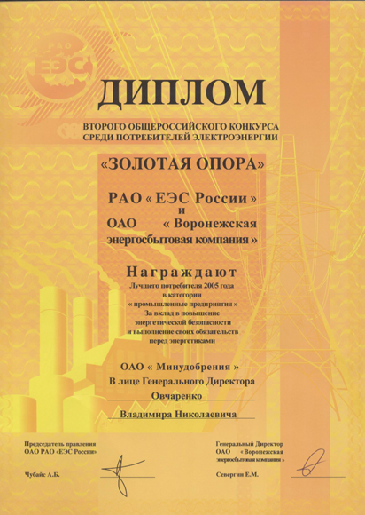 RAO UES of Russia and Voronezh Power Supplying Company awarded MINUDOBRENIYA JSC with the prize "Golden Support” for contribution into increase of power safety and execution of the liabilities towards the power suppliers. |