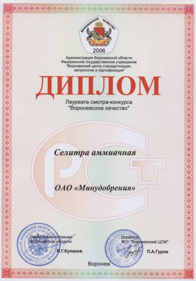 The products of MINUDOBRENIYA: ammonium nitrate, NPK grades 1:1:1 and 2:1:1, liquid technical ammonia became the winners of the Show – Contest VORONEZH QUALITY 2006. |