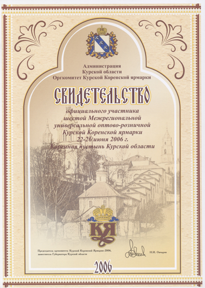 Certificate of Official Participant of Kursk Korensk Fair |