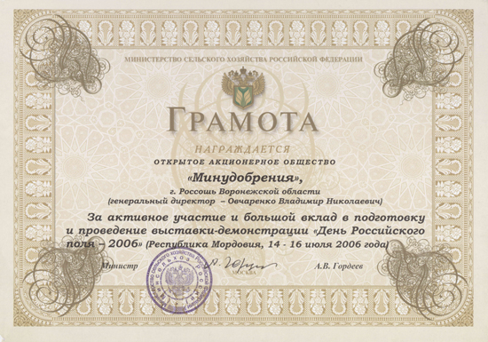 MINUDOBRENIYA JSC was given a diploma for taking active part and great contribution to preparation and conduction of exhibition – demonstration “Day of Russian Field – 2006 held in Mordovia on July 14-16 |