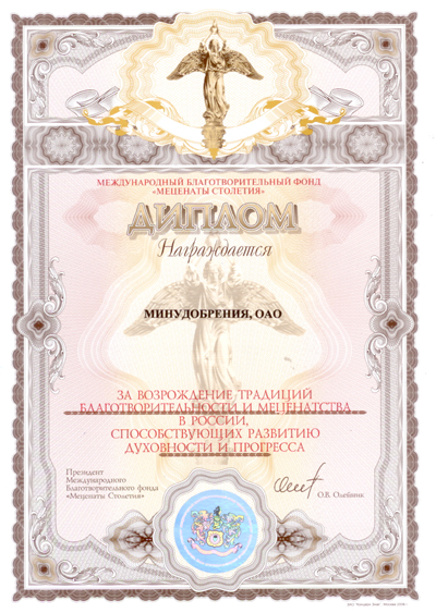 International Charity Fund “Metsenats of the Century” rewarded MINUDOBRENIYA JSC with the Certificate “For Revival Of Traditions of Charity and Patronage of Art in Russia Helping to Develop Spirituality and Progress”. |
