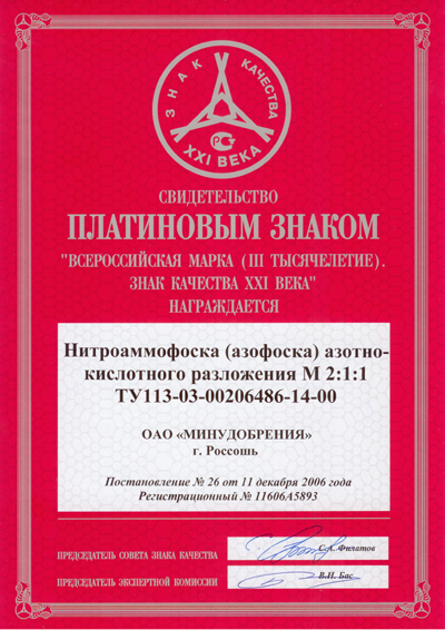 At final stage of the competition (2004-2006.) “All-Russian Brand (III Millennium). Sign of Quality of 21st Century” four products of Rossosh chemical factory – liquid technical ammonia, ammonium nitrate, NPK grades 1:1:1 and 2:1:1 — were awarded with honorary Platinum Signs. |