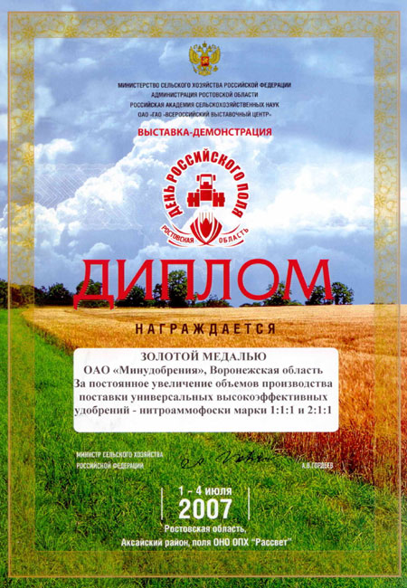 MINUDOBRENIYA JSC was warded with the Certificate and Golden Medal of IV All-Russian Day of Field held on July, 1-4 in the settlement of Rassvet of Rostov Region for constant increase of production volumes and deliveries of universal and highly efficient NPK grades 1:1:1 and 2:1:1. |
